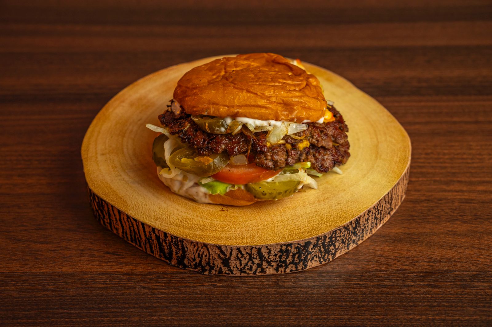 Potato Bun, Two Smashed Patties, American Cheese, Pickled Gherkins, Tomato, Lettuce, Buttery Griddled Onion, Jalapenos, ABSOLUTE Sauce