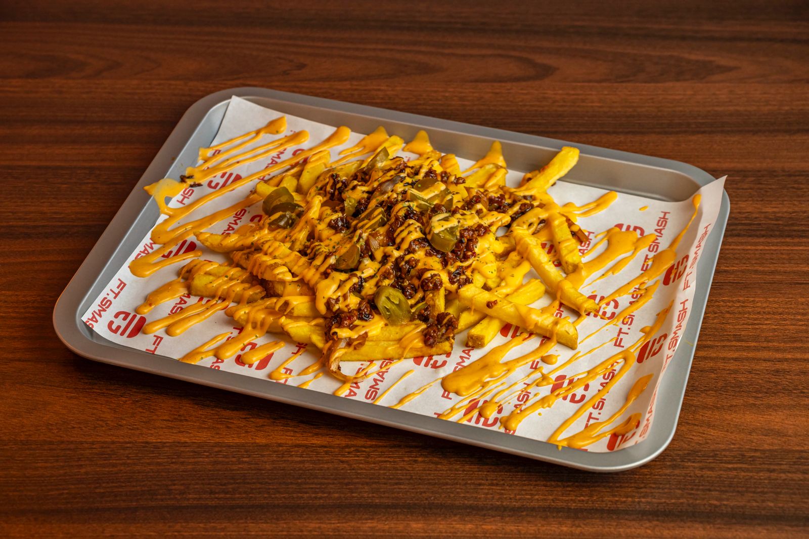 Skin On Fries, British Cheddar Cheese Sauce , Loaded With Ft.chef’s Speacial Mix Beef Mince,Chillis, Onions, Jalepeneos, Ft.smash Sauce And Garnished With Parsley