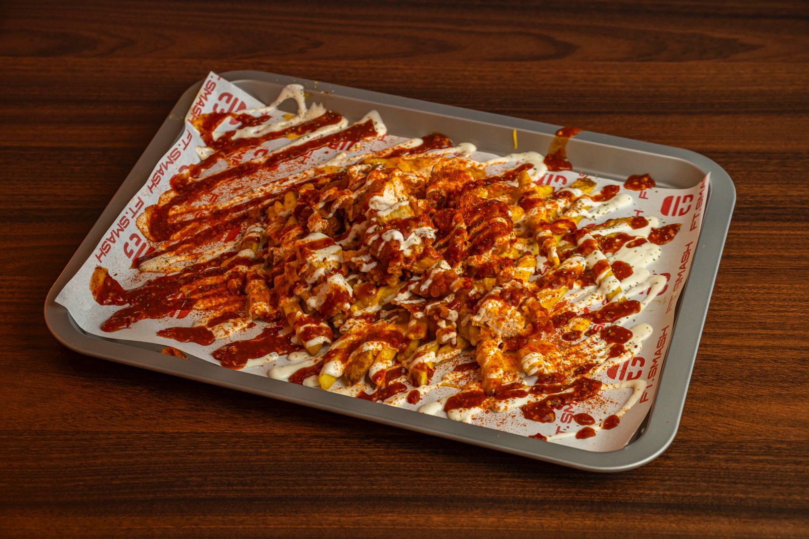 Skin On Fries,British Cheddar Cheese Sauce, Loaded With Ft.chef Hot. Nashville Chicken , Topped With Rancho & Red Sauce, Garnished With Parsley